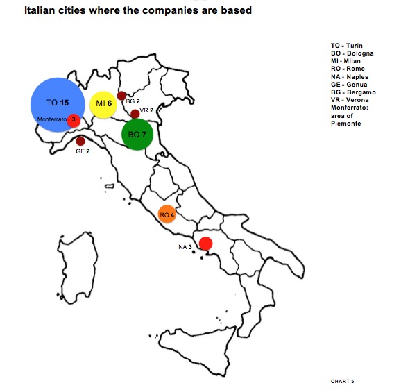 - Turin (15), Bologna (7), Milan (6) are the cities with the highest rate of companies. Those cities are all in the North of the Country.