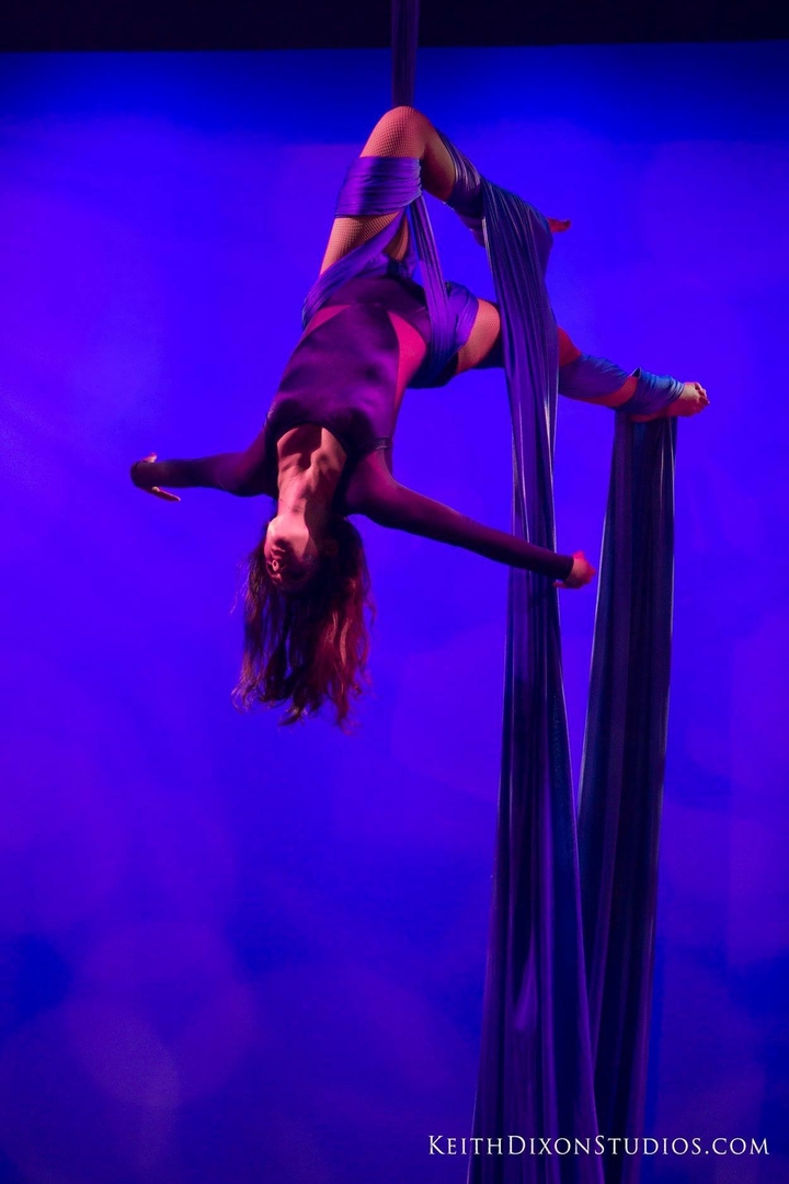 I am an aerialists from Kingsport Tennessee USA. Who specializes in aerial silks, with experiences on lira, Spanish web, and lollipop lira (Both Solo and Doubles acts).