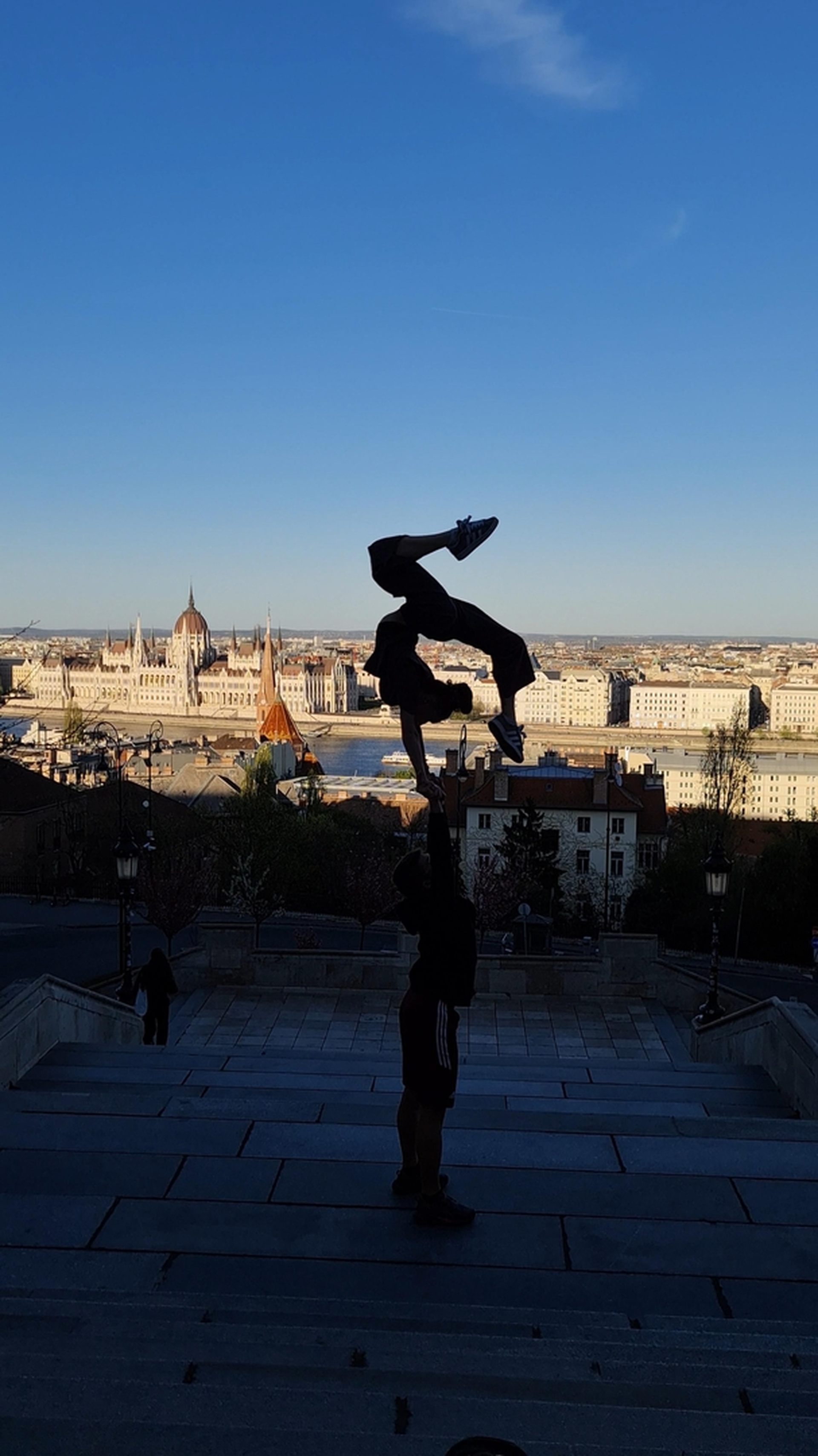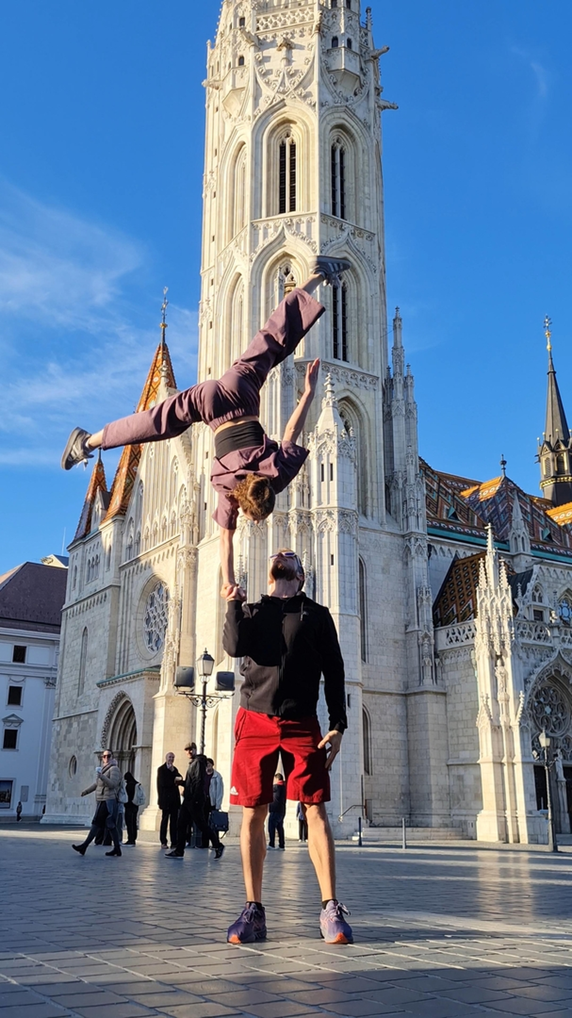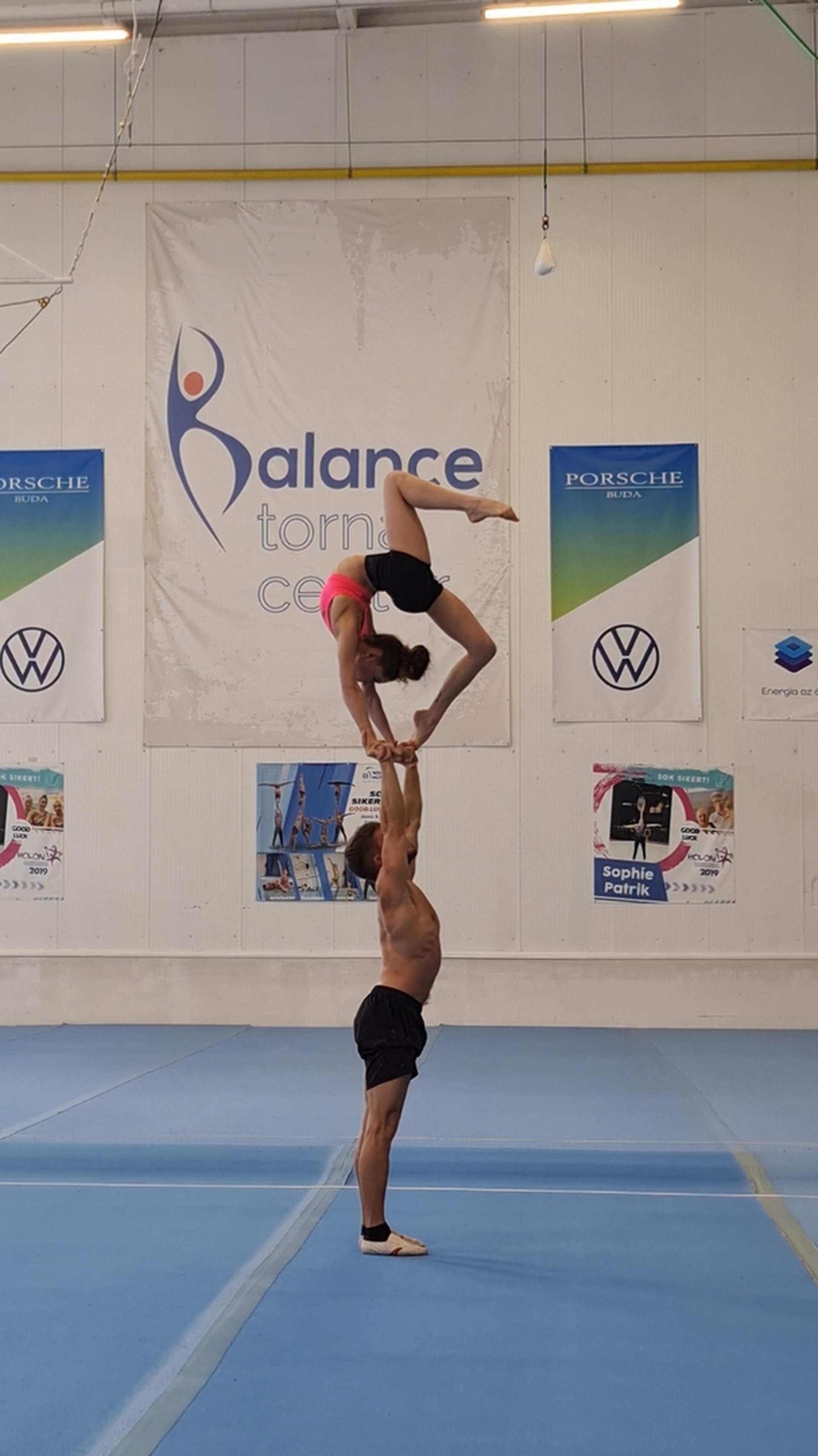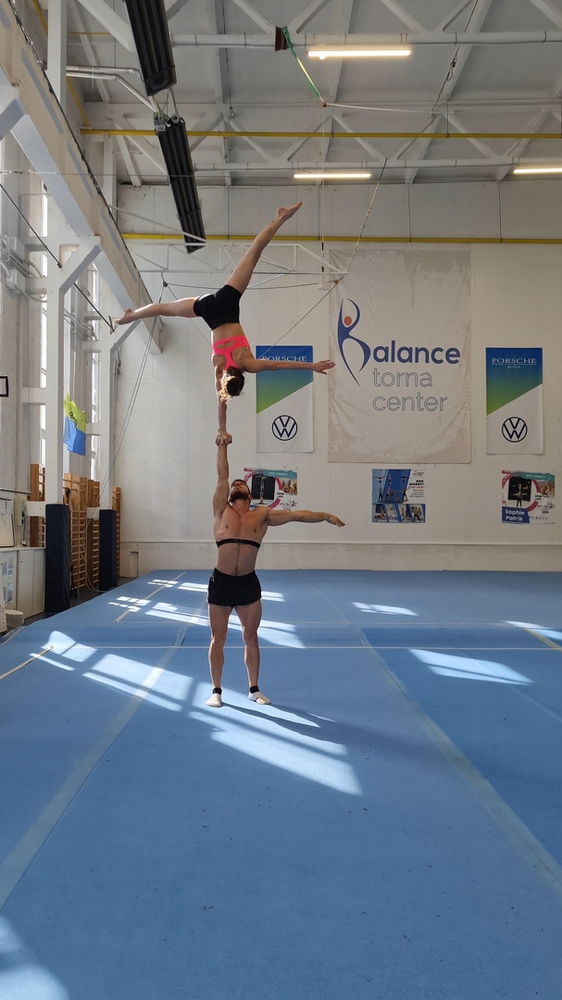I specialize in acrobatic gymnastics: duo, duo straps, aerial hoop, aerial silk, aerial loop / straps, contortion, hand balancing and team exercises as a top.