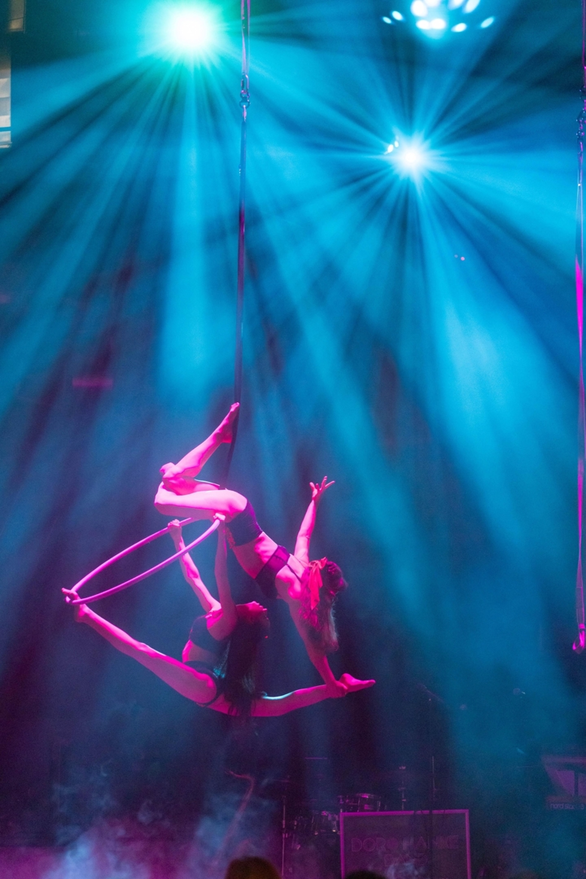 I teach a weekly Aerial Hoop class, which brings me great joy. On weekends, I perform and teach workshops — sometimes together with my duo partner Lili and sometimes as a solo artist.