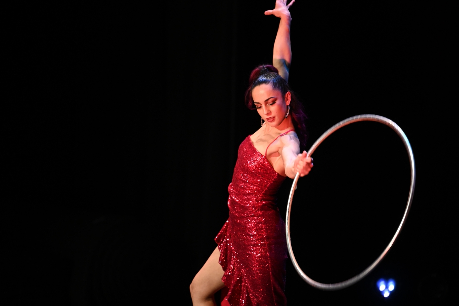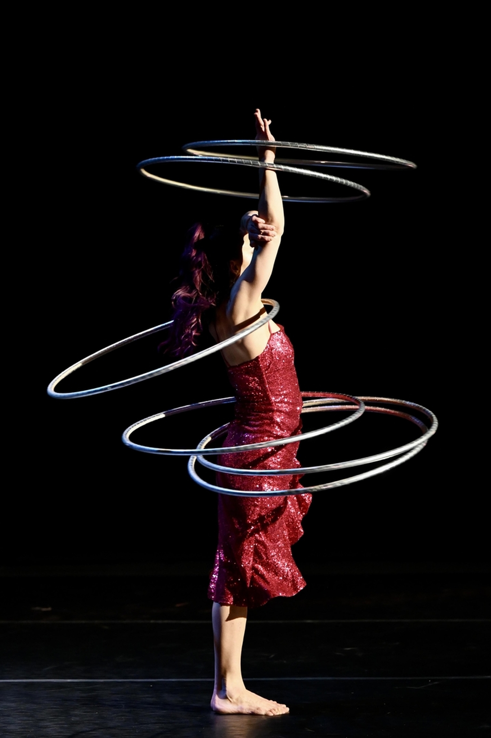 Maia Castro-Santos is a circus artist specializing in hula hoops and aerial hoop. She fell in love with the physical challenge and creative possibilities of her disciplines when she began her training at eight years old at the New England Center for Circus Arts. She toured with Circus Smirkus as a teenager and studied Cognitive Science at Columbia University before leaving school to pursue circus arts full time. Maia has worked for companies across the US, and she currently hops between her home base in Vermont and performing for Spiegelworld at "The Hook". She has collaborated with the classical music community, performing for the Gainseville Symphony Orchestra and Opera Vermont. Playful, dangerous, and passionate – she inspires audiences with infectious joy and ferocity.
